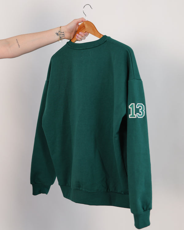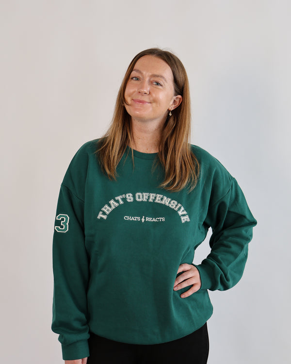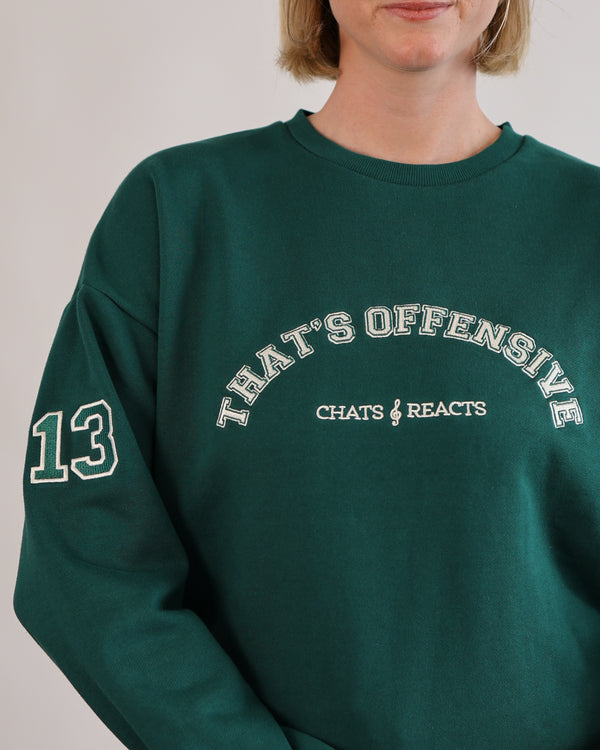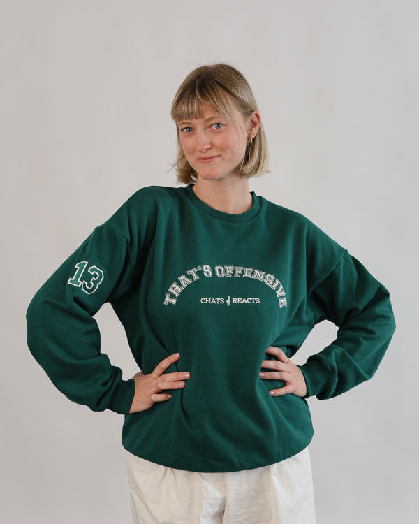This crewneck is sooooo offensive! A beautiful, deep green colour embroided with 'that's offensive' and 'chats & reacts' on the front, and a '13' on the sleeve, we have to admit that this is our favourite. For a slightly oversized look, we recommend sizing up. Please check out our size guide for more info on the right fit for you!
